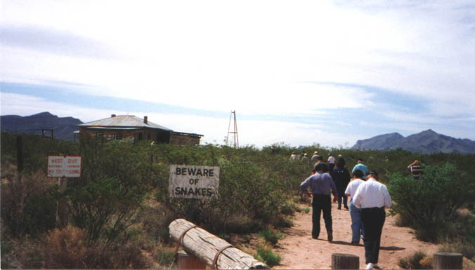 Last in queue is Johnson Fields. Ahead of him are Bob and Christine Versaw, I think. I believe Jim Eckles said the windmill tower was actually used as a wind charger to charge batteries. The windmill for water was out of sight to the left of the ranch house. This view is facing south. WSMR is approximately 3,400 miles thataway. :-)